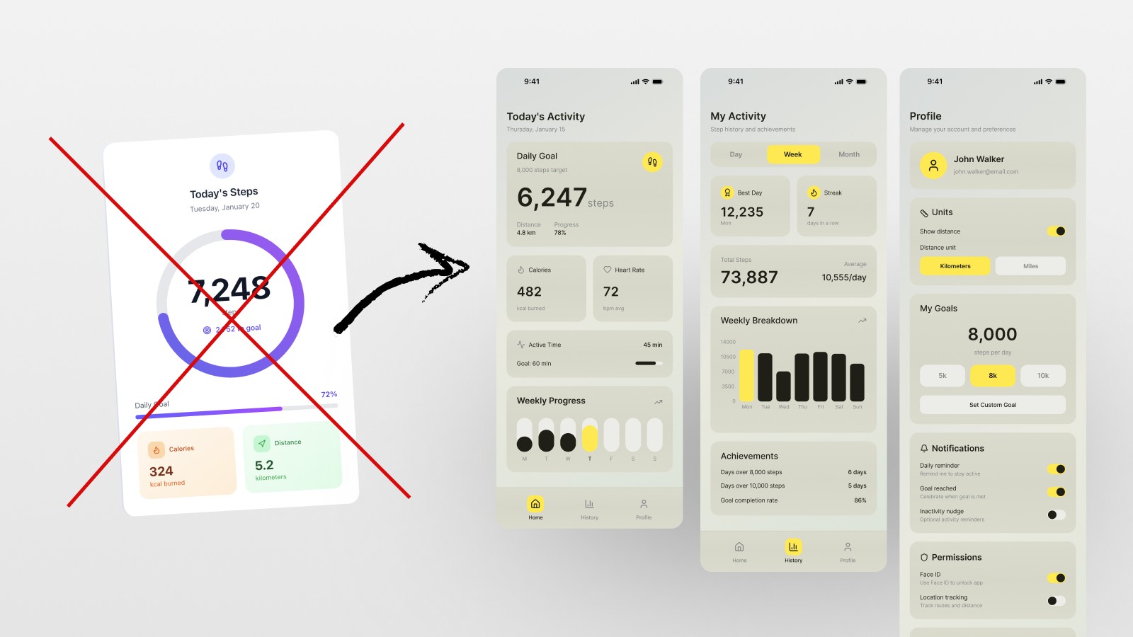 Main screens for an MVP steps tracker app