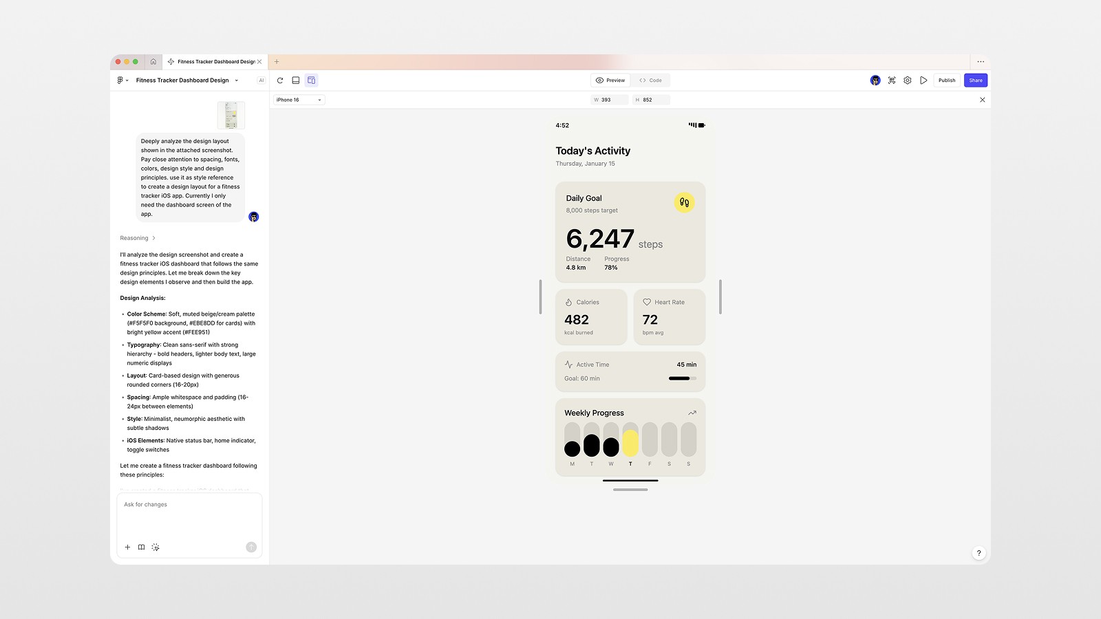 Deeply analyze the design layout shown in the attached screenshot. Pay close attention to spacing, fonts, colors, and design principles. Use it as a style reference to create a dashboard screen for a fitness tracker iOS app.