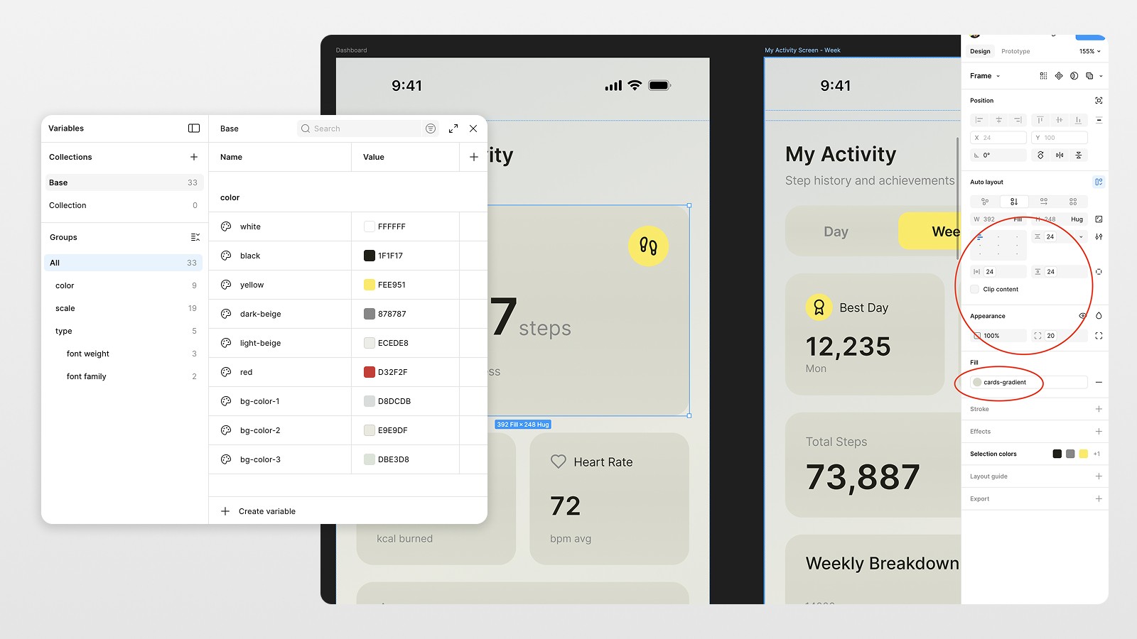 In Figma, gradients still can't be set in variables, so while using variables for colors, spacing, and typography, I left gradients as styles with using color variables for gradient color structure.