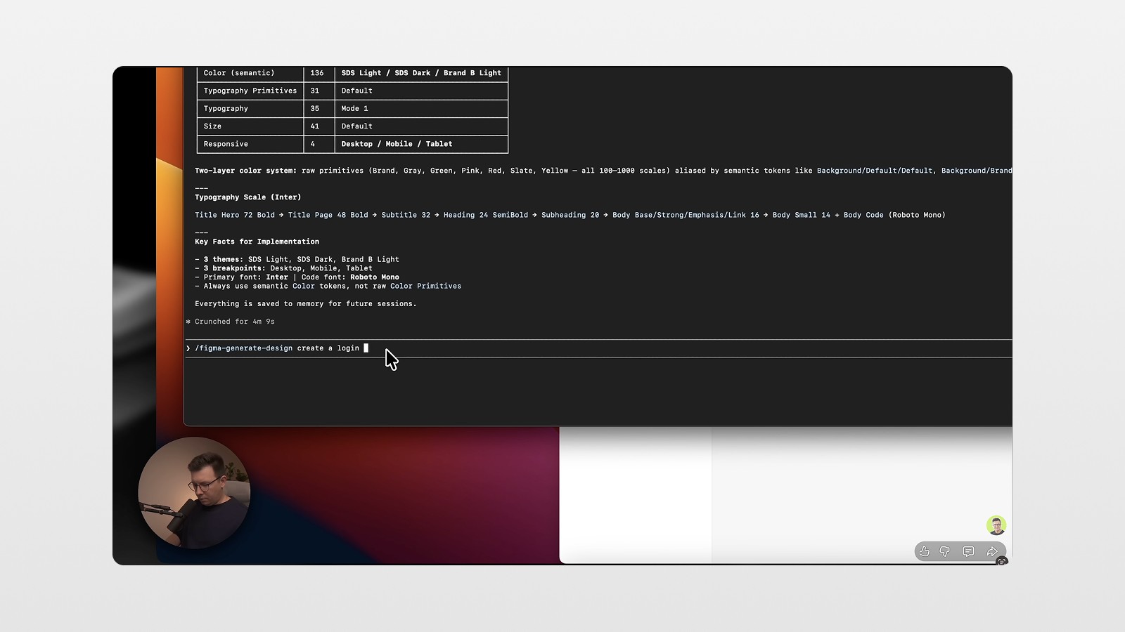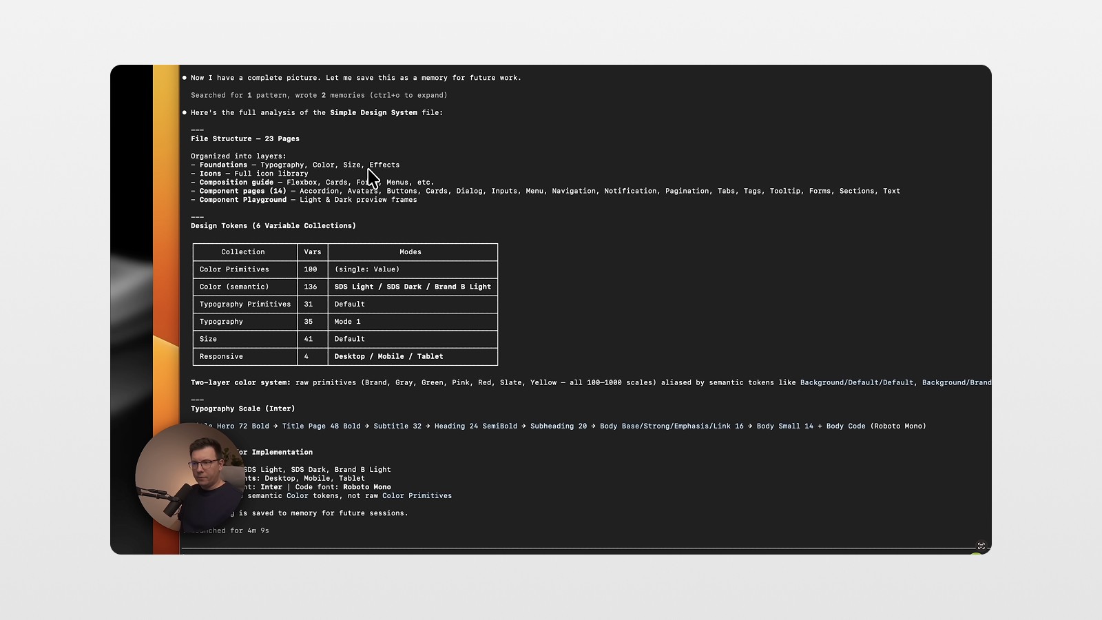 Claude will read through your library — components, text styles, color variables, the whole thing — and build an internal understanding of your design system. You'll see it log things like "inspecting typography scales," "reading color tokens," "cataloguing component inventory." This is Claude doing the prep work so everything it generates later is on-brand. 🤯
